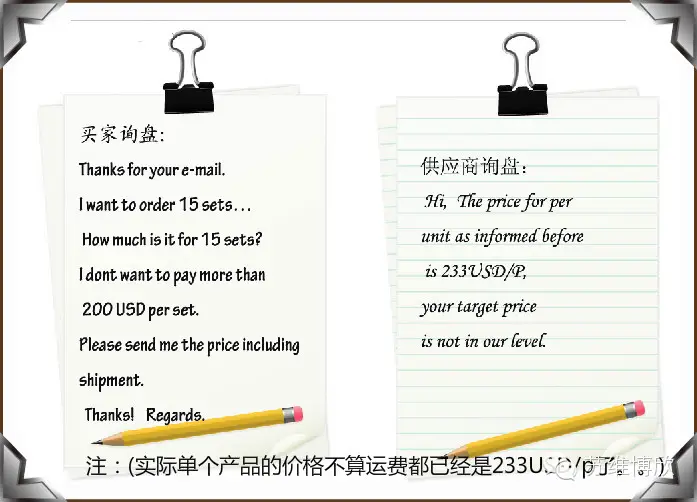 在外贸销售中价格一直是业务员较为困扰点。首先我们要明白:价格永远不是销售的决定因素!其实客户跟你压价是很正常的事情,作为外贸业务员先要心理上接受它,然后再去理性分析客户为何抱怨价格高,查出真正原因才能想法把客户拿下。我们看下图的案例: 看到案例中这种询盘的情况,建议从以下几点验证客户采购价格的真实性: